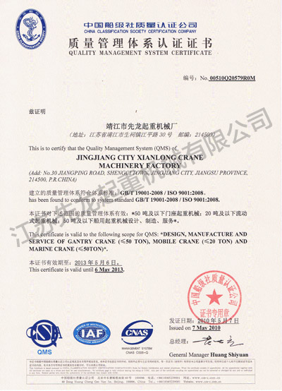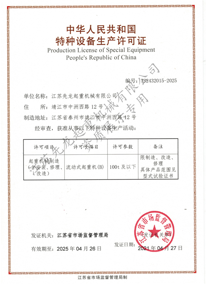 江蘇先龍起重機(jī)械有限公司(原靖江市先龍起重機(jī)械廠)是改制后的獨(dú)資企業(yè),本廠是生產(chǎn)起重運(yùn)輸機(jī)械的專業(yè)化企業(yè),并先后通過了ISO9001:2000質(zhì)量管理體系認(rèn)證、獲得國家頒發(fā)的HGQ50T固定式起重機(jī)和DLQ20T輪胎式起重機(jī)的特種設(shè)備制造許可證、特種設(shè)備安裝維修改造許可證。